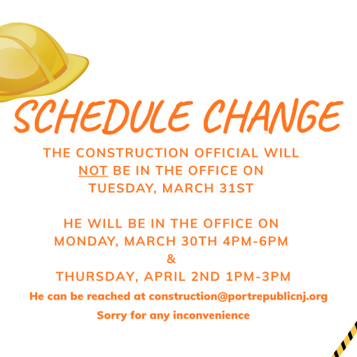 Published July 28, 2025 The Construction Official will be in the office Tuesday, August 5, 2025, 4PM – 6PM. He can also be reached at construction@portrepublicnj.org OR 609-652-1501